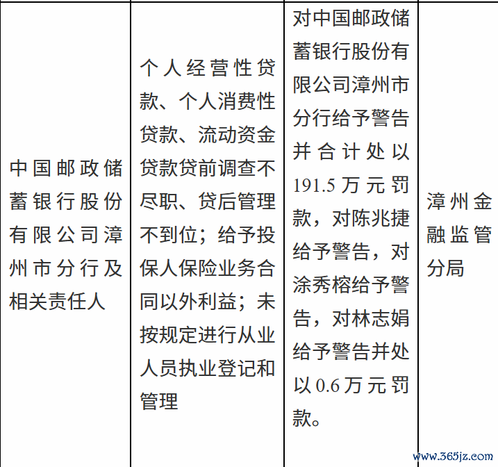 1月9日,漳州金融监管分局行政处罚信息公示表显示,中国邮政储蓄银行股份有限公司漳州市分行因个人经营性贷款、个人消费性贷款、流动资金贷款贷前调查不尽职、贷后管理不到位;给予投保人保险业务合同以外利益;未按规定进行从业人员执业登记和管理等被给予警告并合计处以191.5万元罚款,责任人陈某捷、涂某榕被给予警告,林某娟被给予警告并处以0.6万元罚款。